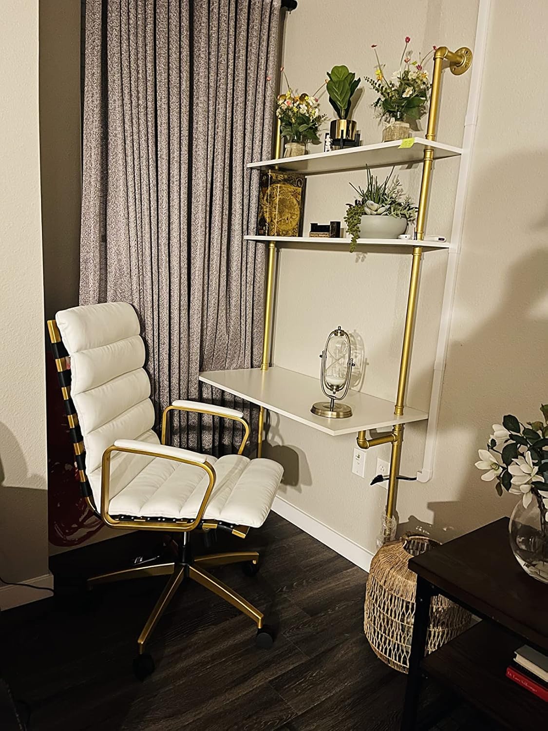 MAIKAILUN White and Gold Desk, 36" Ladder Desk, Wall Mount Computer Writing Table Pipe Shelf Shelving Mini Narrow Industrial Modern for Small Spaces(36x20x81)